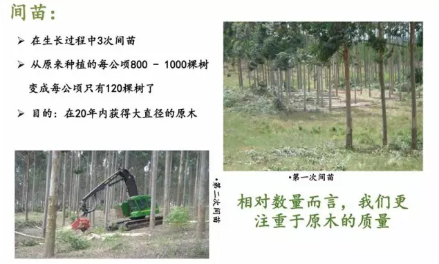 在樹木生長(zhǎng)的過(guò)程中,通過(guò)間苗的方式將生長(zhǎng)不好的樹木淘汰掉。使得樹木最后的質(zhì)量更好,開料后的木材等級(jí)也更高。
