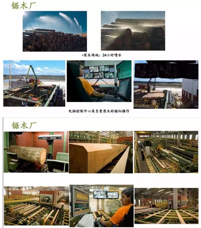 原木樹干運(yùn)到鋸木廠,在原木場(chǎng)地會(huì)進(jìn)行24小時(shí)的噴水,保持木材的濕潤(rùn)。若在陽(yáng)光下暴曬會(huì)導(dǎo)致開裂,那么好好的木材也就報(bào)廢了。然后利用電腦進(jìn)行篩選判斷之后進(jìn)行切割,避免木材的浪費(fèi)。