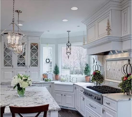 所以,如果櫥柜做到頂要滿足空間感及美觀的一般是廚房空間比較大,甚至是開放式廚房,設計層次感較多,相對復雜一點,并且很少會有現(xiàn)代風格的,如下圖: